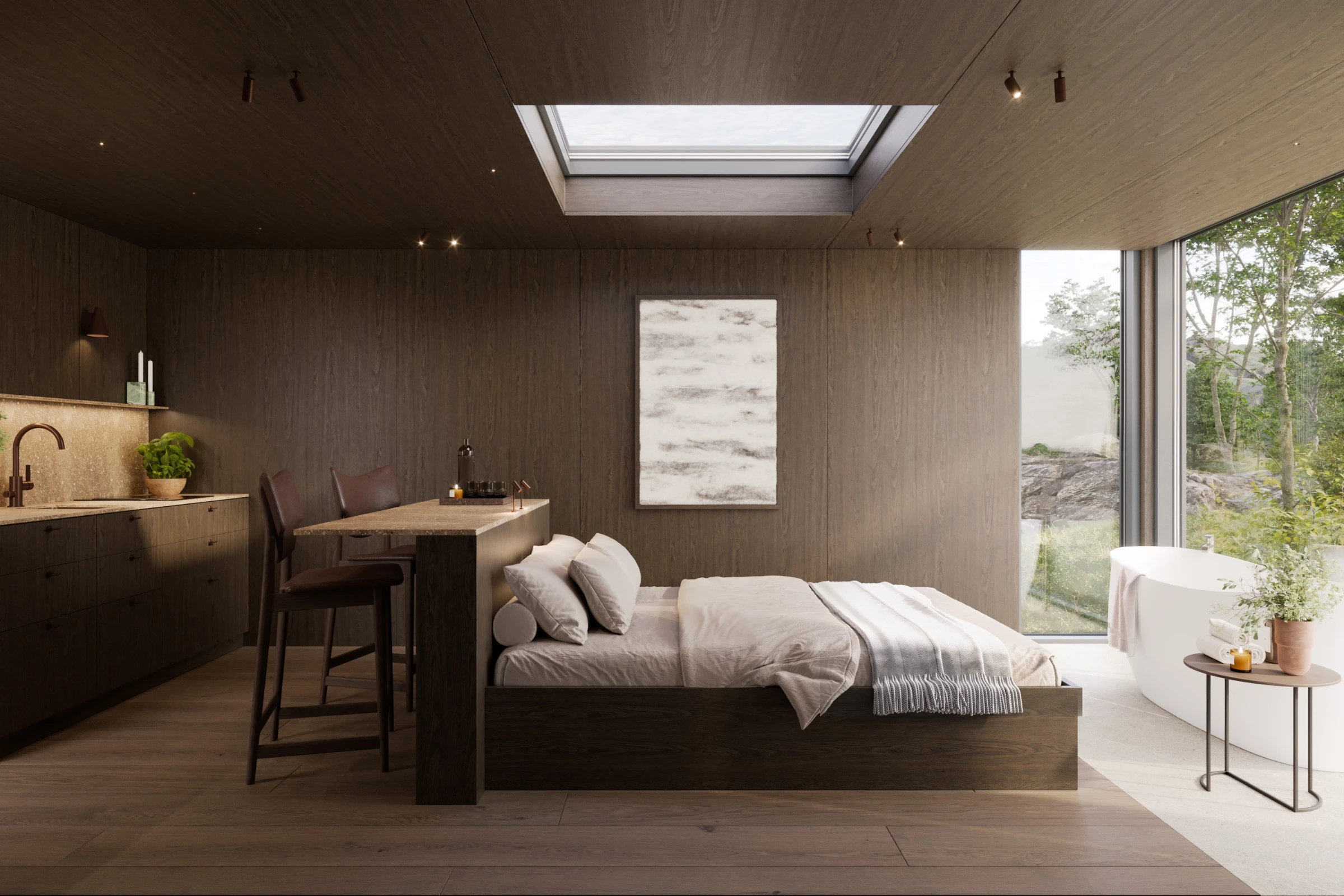 Modellene med kjøkken leveres med kjøkken fra Huseby, komplett med integrerte hvitevarer og benkeplate i Corian – et slitesterkt og vedlikeholdsvennlig materiale med et rent og helhetlig uttrykk. Løsningene er utviklet for å fungere like godt i privat bruk som i utleie, over tid.