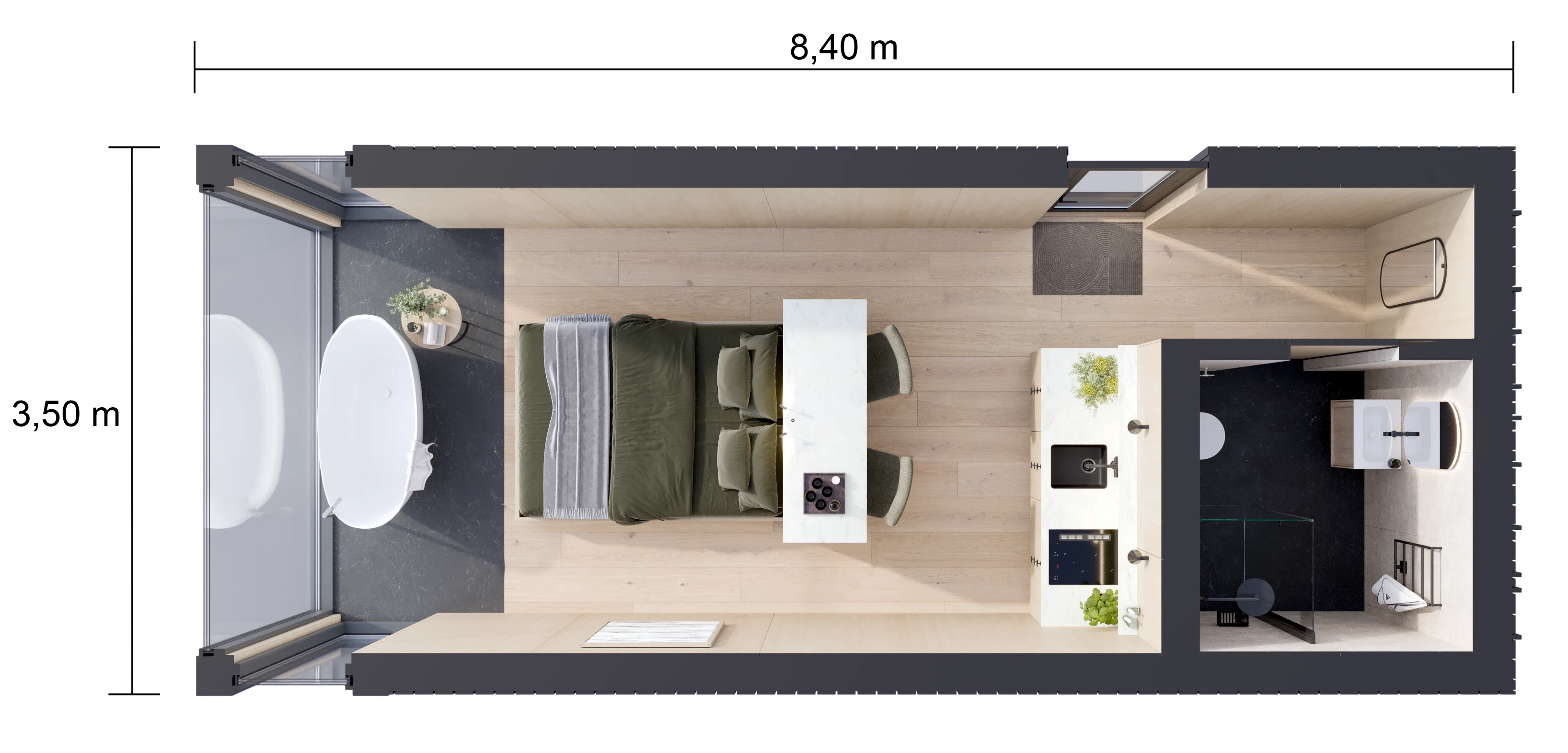 Vi introduserer Omgi Signature 2, en eksklusiv hytte på 29 kvadratmeter som redefinerer luksus i naturen. Her er badekaret plassert helt i front, foran sengen, slik at du kan nyte enestående utsikt mens du slapper av. Et stort panoramavindu i front, kombinert med gulv-til-tak-glass på sidene, lar deg nyte utsikten fra alle vinkler og visker ut skillet mellom ute og inne. Signature 2 er skreddersydd for high-end reiseliv og gir gjestene en uforglemmelig opplevelse av å være i ett med omgivelsene.
